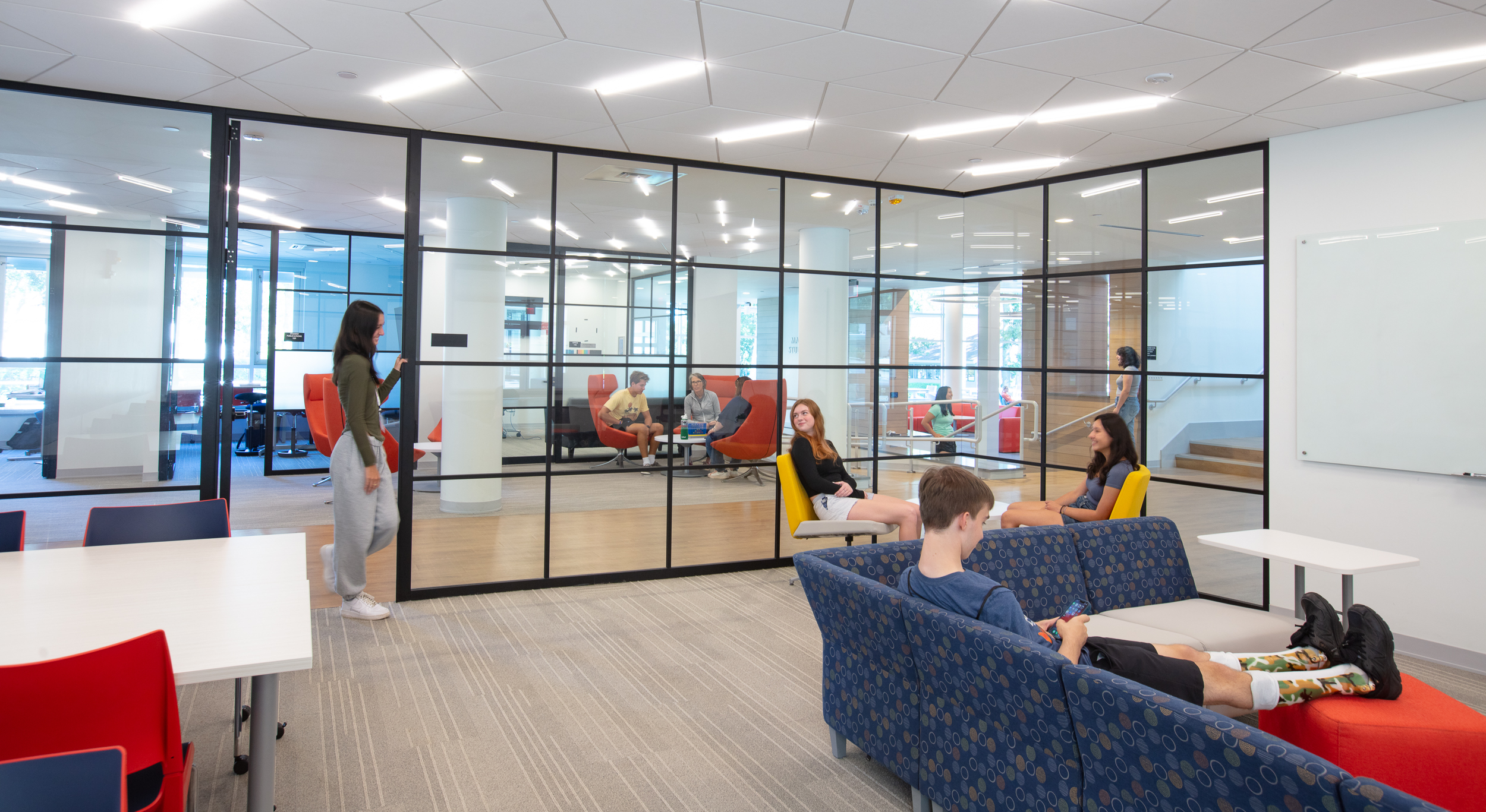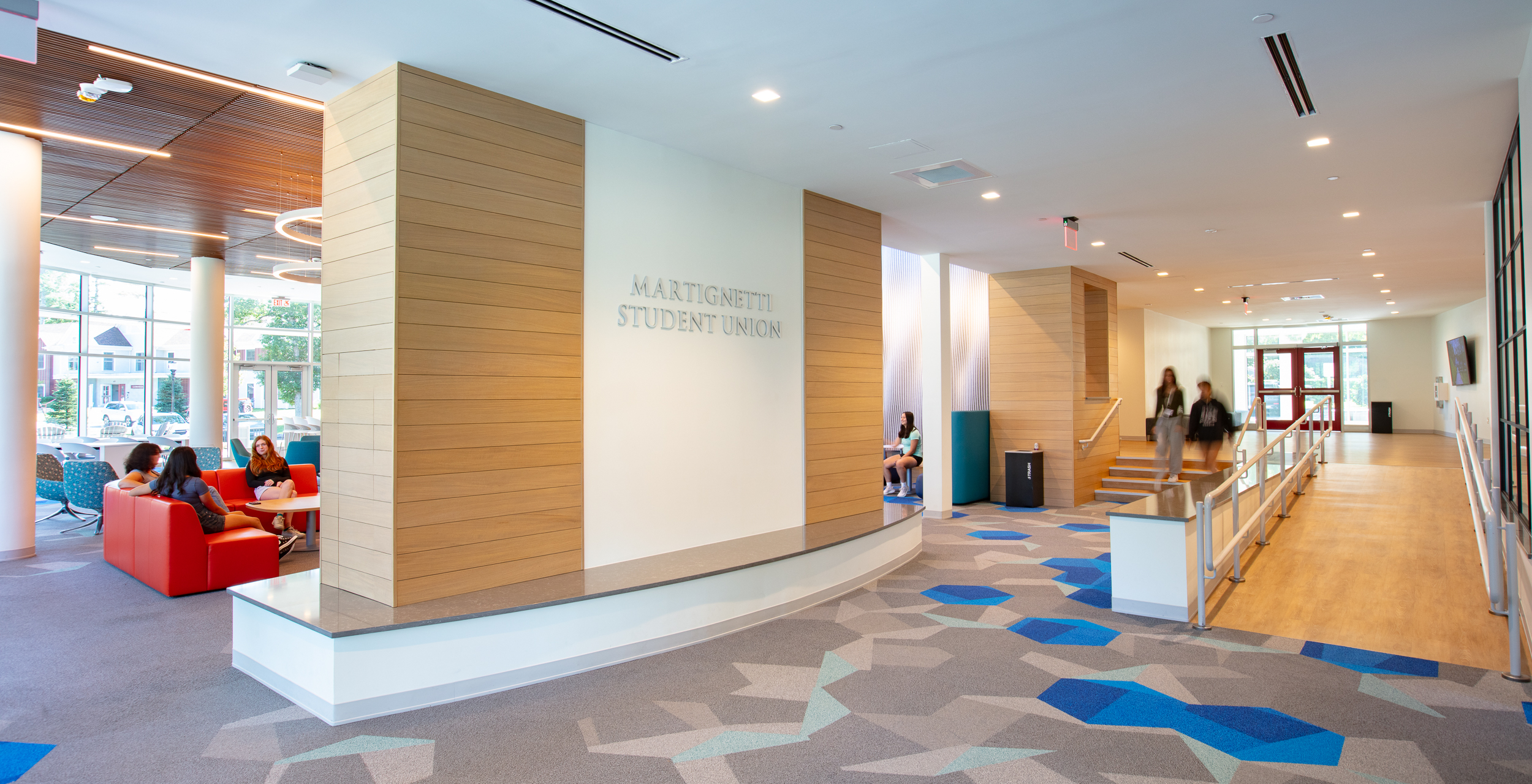 The Travis Roy Campus Center, located at Tabor Academy (a boarding and day school for grades 9-12) features a variety of spaces for students and faculty to connect intellectually and socially. From quiet study in the library on the second floor to socializing on the patio, club meetings in the collaboration room, or grabbing a snack at the café in the Student Union, everyone can come together to find a place to meet. Throughout the building design, we emphasized transparency, using thin, black-framed glass walls for the student life offices and the collaboration spaces in the hope that students would notice the accessibility of faculty and see students in positive interaction. Our goal was to lead students toward engagement in the community and among each other. Providing both architectural and interior design services, we took the opportunity to use bright modern furnishings and large glass windows and walls to create a playful, welcoming tone to the space. The sound-absorbing qualities of the undulating decorative felt wall and the wood-slat ceiling keep the volume down in the Student Union, given that more quiet endeavors are undertaken just upstairs in the library. The “Trav” has truly become the “family room” for Tabor Academy.